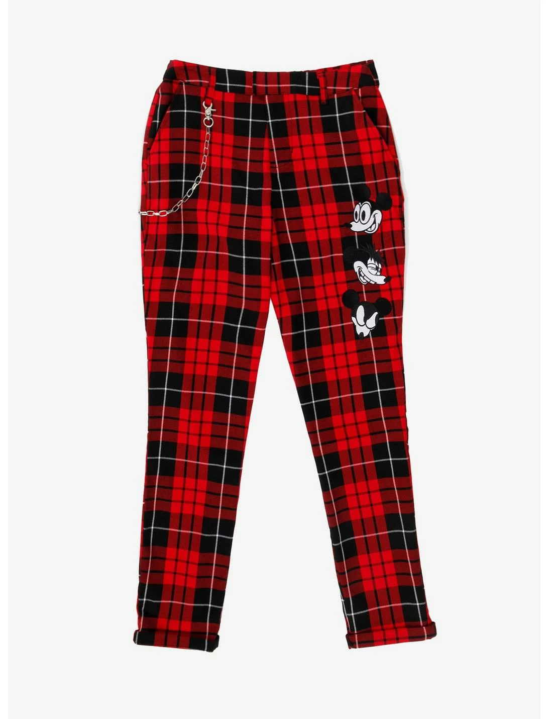 Plaid never goes out of style just like a True Original! These red, white and plaid pants feature embroidered Mickey Mouse heads down the left leg and a detachable chain.