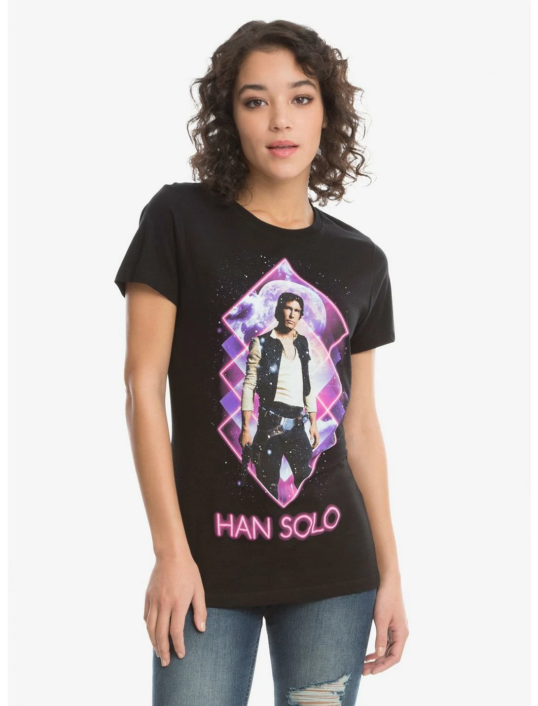 The sexy scoundrel is back in all his glory on this fitted Han Solo neon retro tee! Return to 1977 and the days of the neon disco era when the Force was awakened in many of us for the very first time! True to size.
