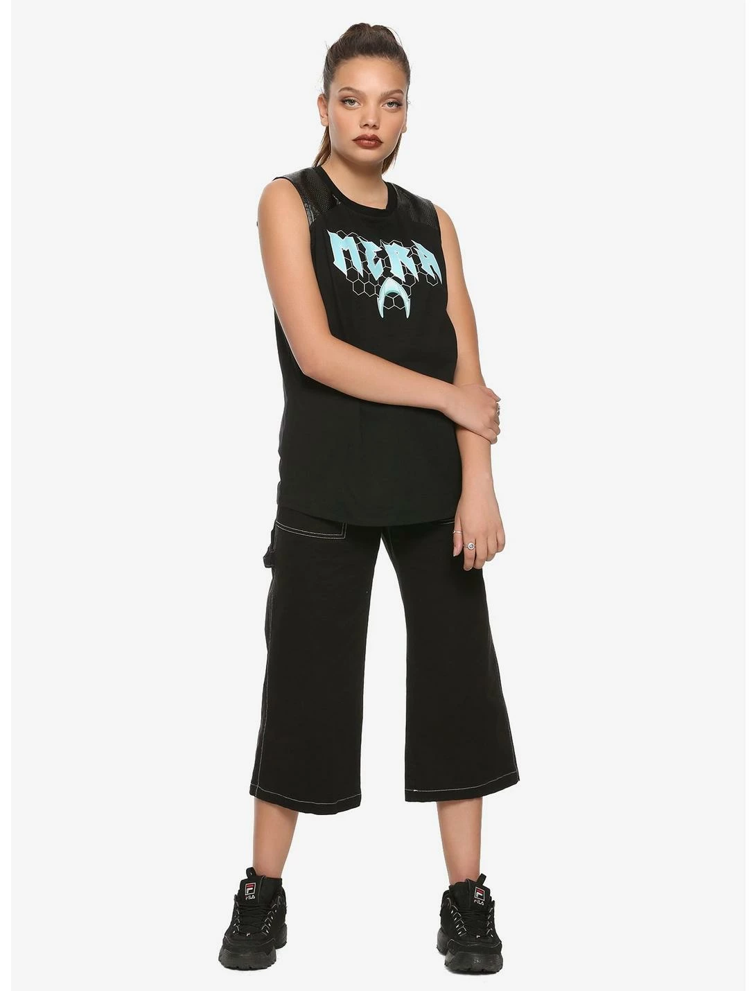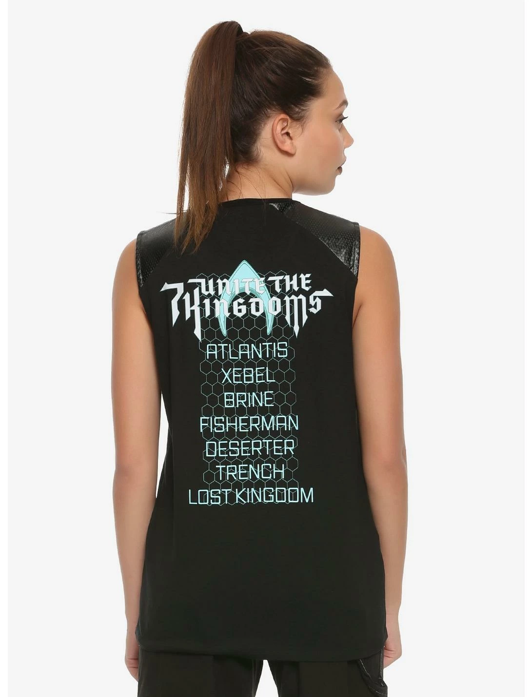 Don’t miss a single action-packed stop on this Aquaman-inspired sleeveless muscle shirt! The front reads “Mera” with “Unite the Kingdoms” across the top of the back with a list of undersea tour stops listed below. The shoulders feature superhero-style netting detail.