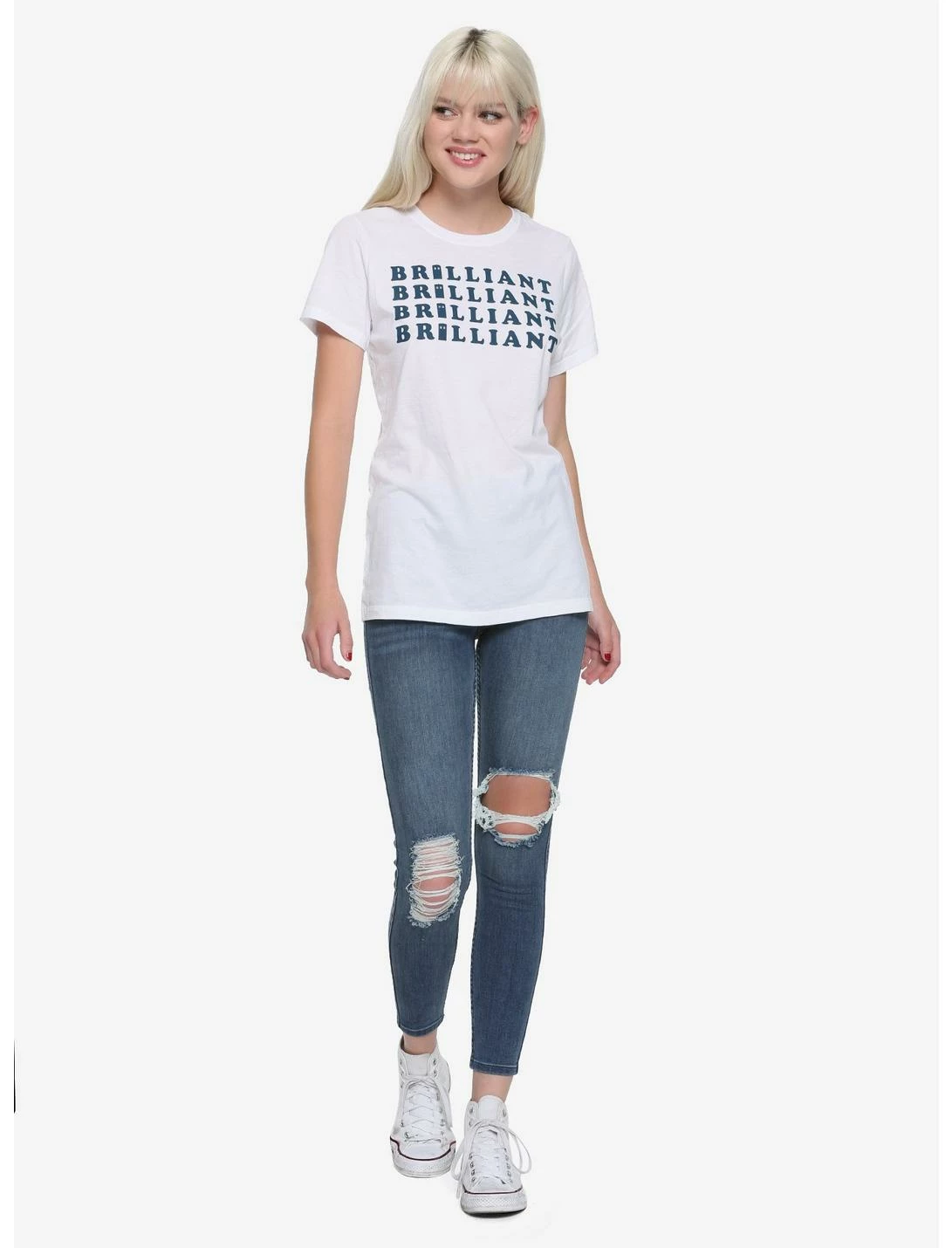 It was once the catchphrase of the Tenth Doctor and now it’s the first word uttered by the Thirteenth, so don’t just say it once, say it four times to make it extra Brilliant! Printed in just the right shade of blue across the front of this soft white T-shirt.Â