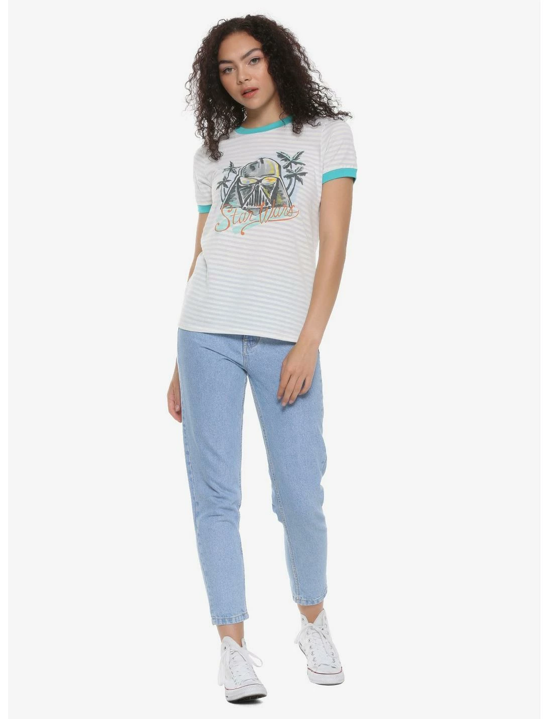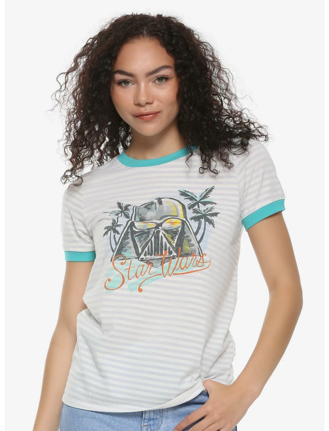 Vacation vibes, Star Wars-style! This striped ringer tee sports a watercolor-esque painting of Darth Vader with the shimmering ocean reflected in his helmet, flanked by palm trees. Perfect for your next trip to the edge of the galaxy.