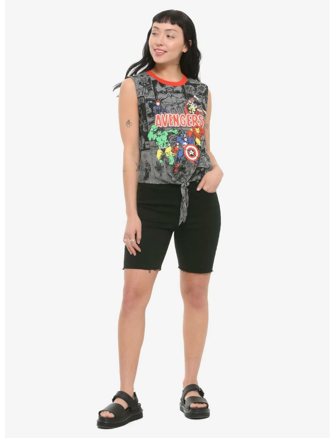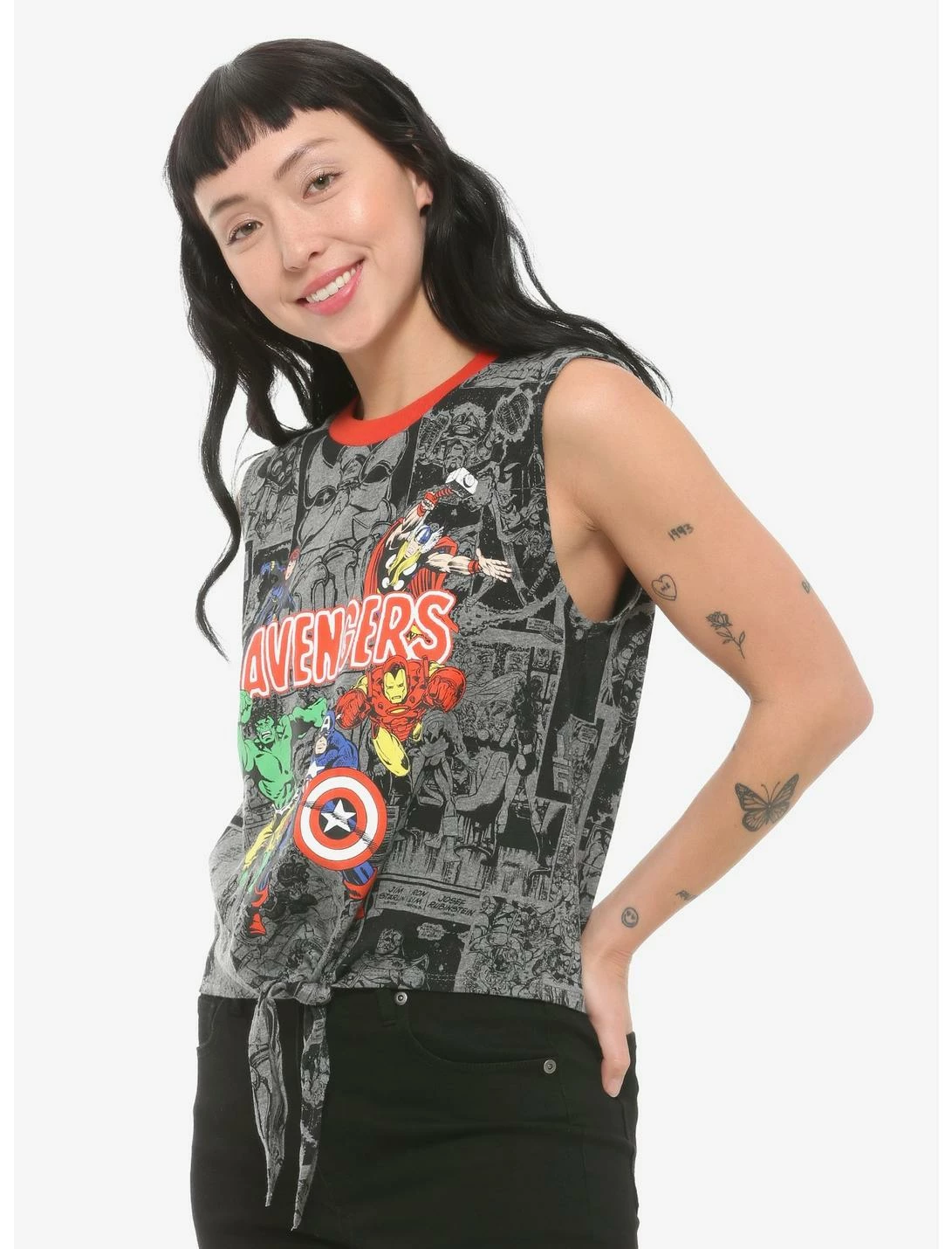 Assemble the Avengers to your look with this comic book-inspired tank top. Printed all over with grey and black comic book panels and 5 of the Avengers in full color in the center. Featuring a tie-front detail and red ribbed neckline.