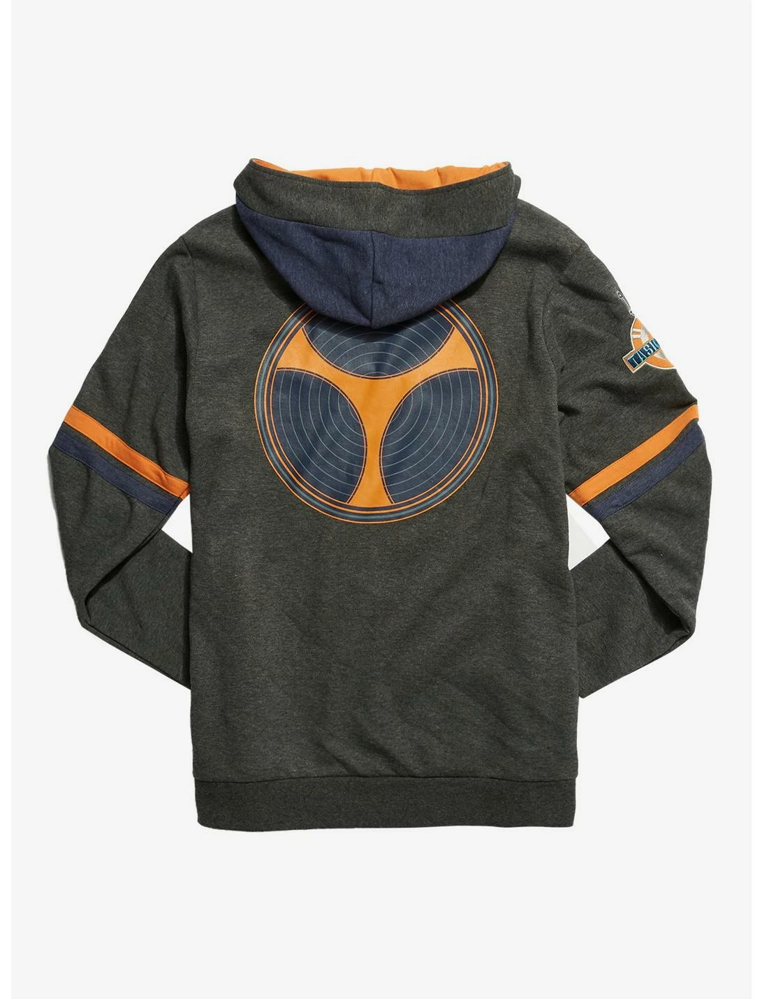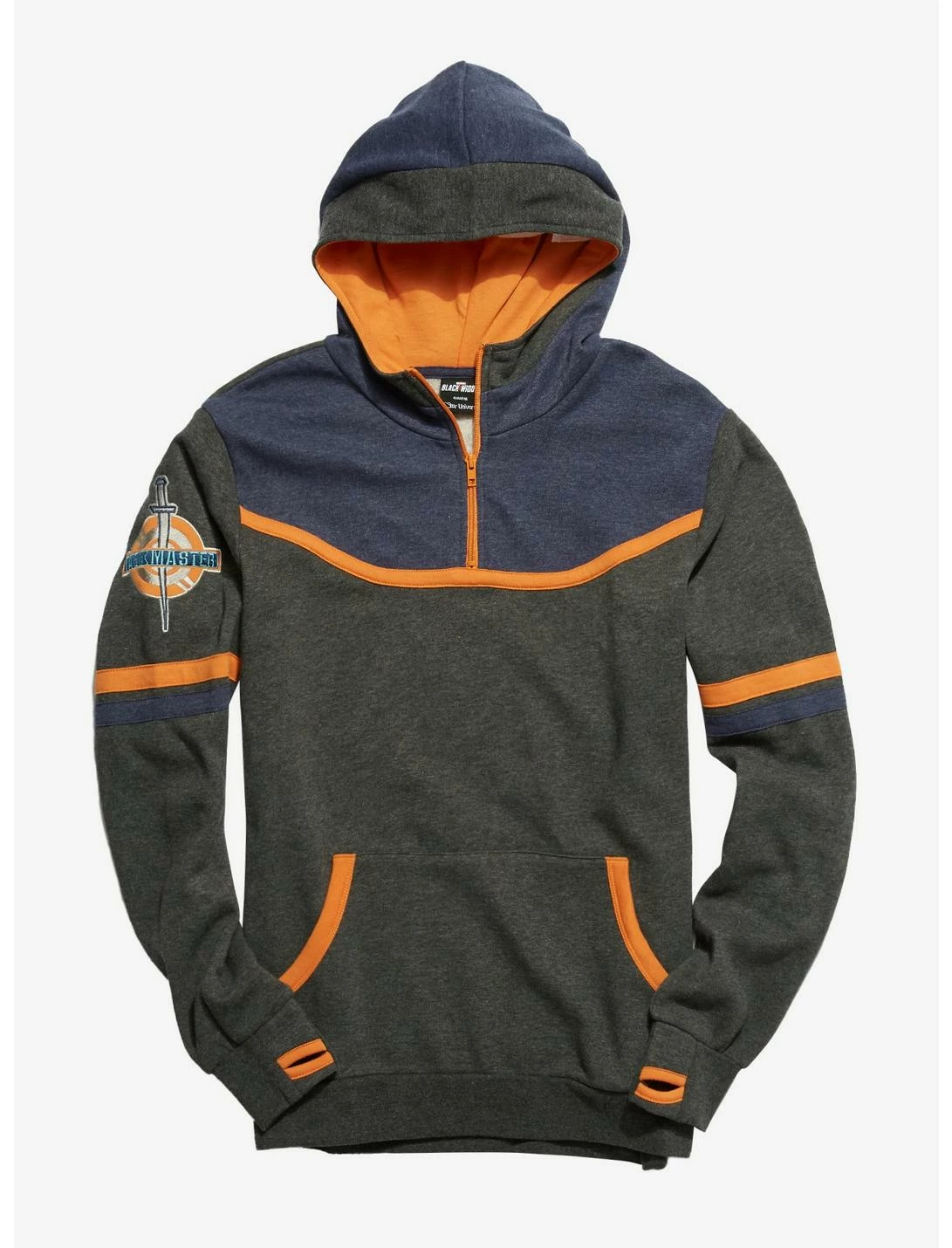 Taskmaster has a photographic memory, so if you’ve ever had a fashion misstep, he’ll come after you! Luckily, there’s no room for error in this hoodie, which is inspired by the mysterious villain from Black Widow. It has Taskmaster symbols on the right sleeve and on the back of the hoodie, a kangaroo pocket, thumb holes on the sleeves, a zip-up neckline, and contrast orange and navy fabric throughout.