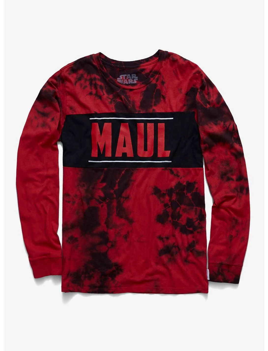 Inspired by Darth Maul, that slippery Sith, this long-sleeve tee is tie-dyed to match Maul’s body tattoos and features a chest panel printed with the evil one’s name in big, bold font. For Dark Side lovers only!